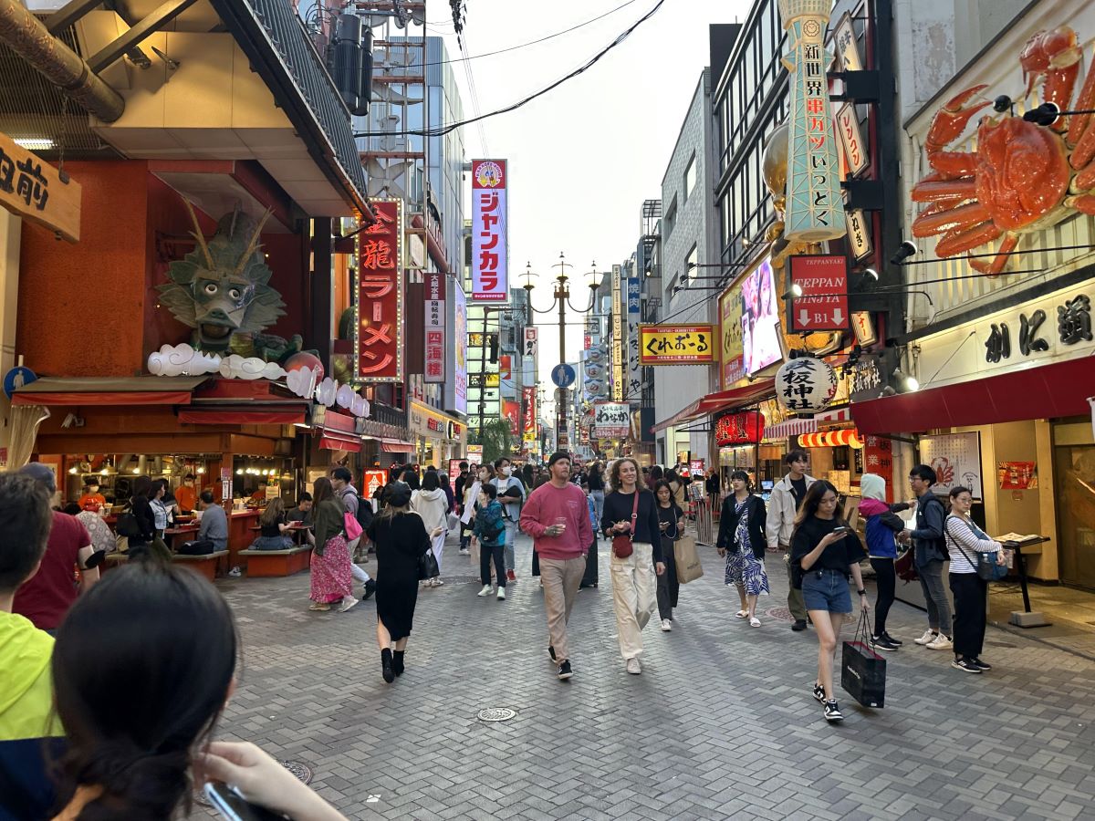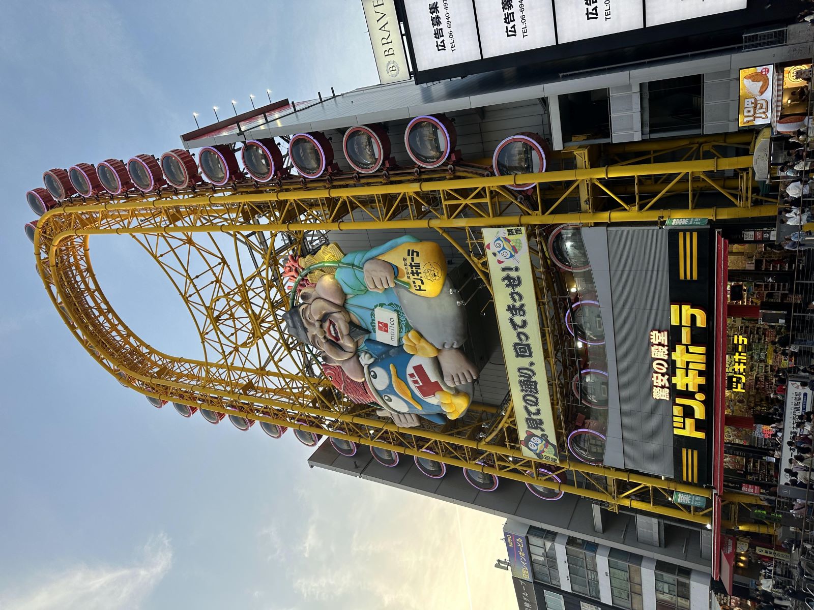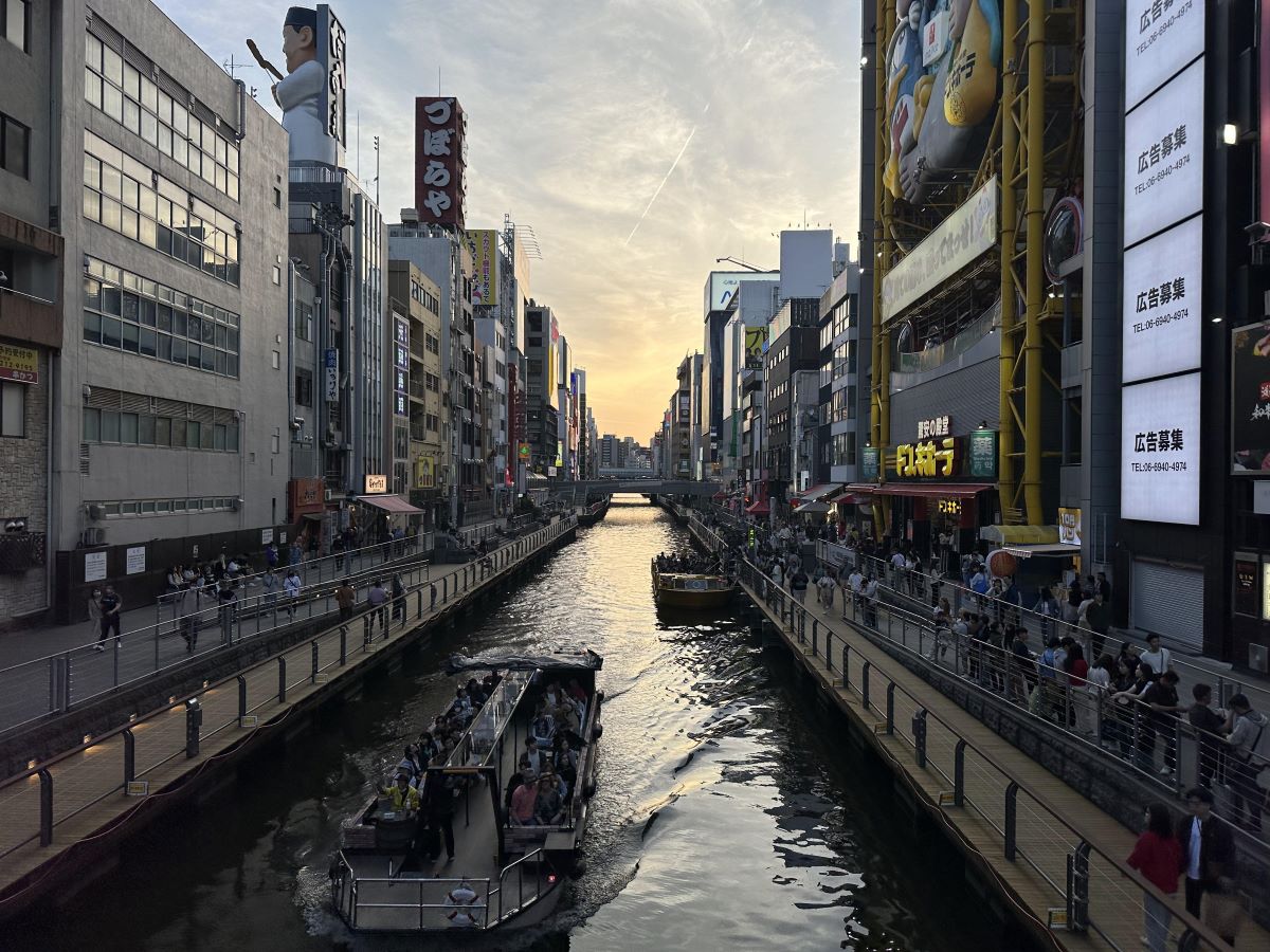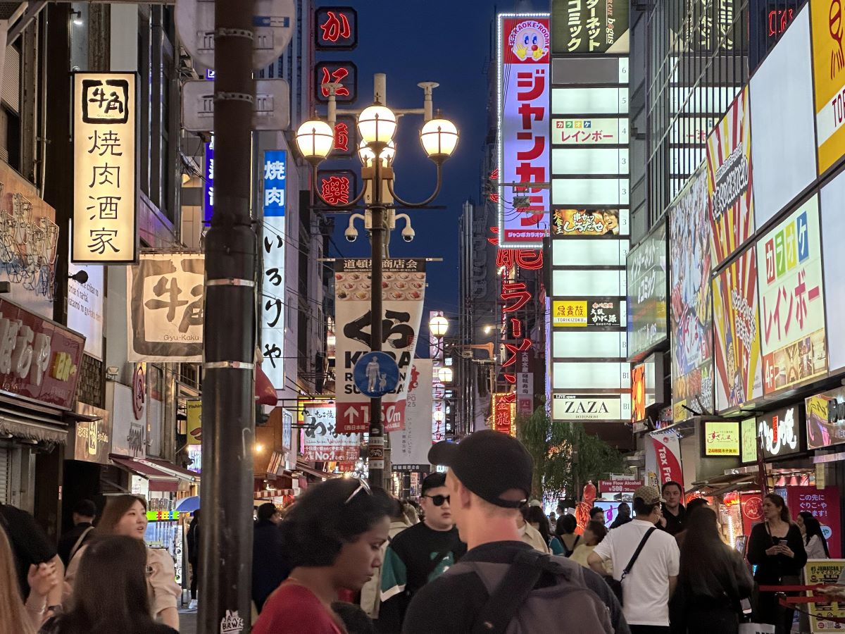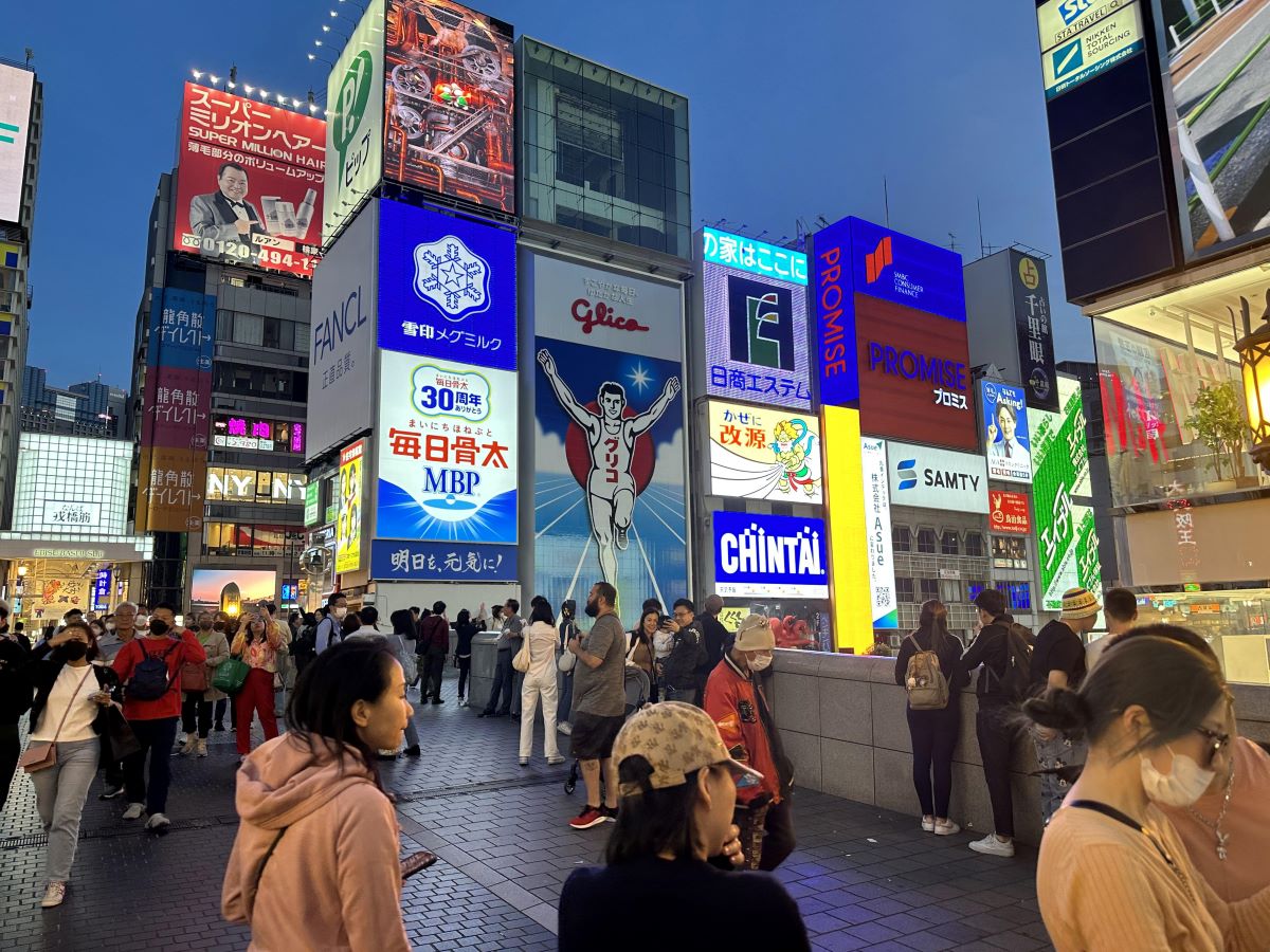 下午抵达大阪,在道顿堀逛街。道頓堀一带,是大阪最繁华的娱乐和商业中心。夜晚的道顿崛,展示了日本的另一番面貌。高耸的霓虹灯招牌,街上的游客摩肩接踵,酒吧餐厅商店人声鼎沸。走在人群中,能遇到提着音响唱歌打碟的艺人,也会擦肩而过高高举起手机直播的年轻人。这就是大阪夜生活,弥漫着各种活力的味道。有点想起《赛博朋克2077》中的夜之城,荒坂塔前的街道同样也是琳琅满目的霓虹灯招牌。